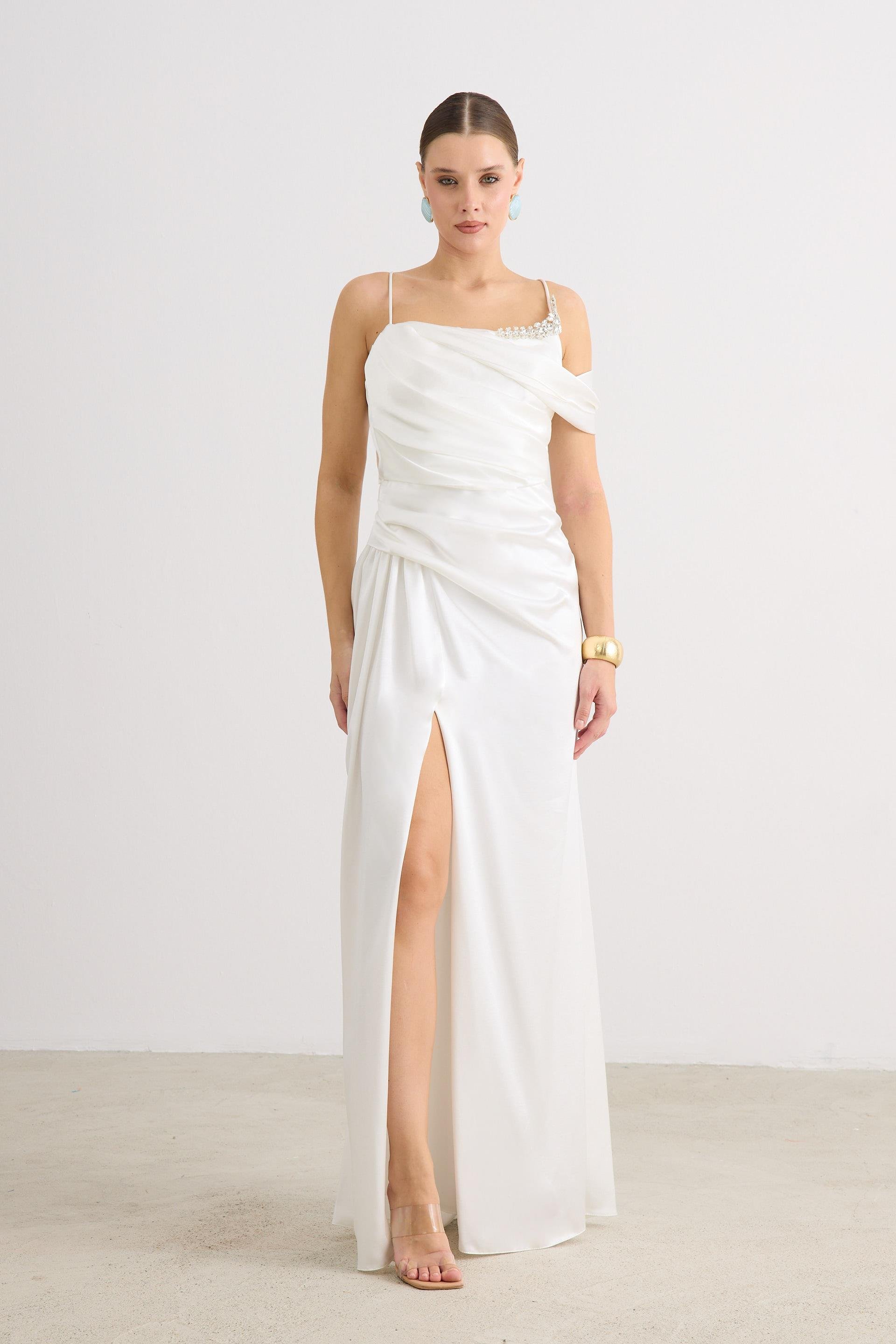 58576-2CARMENCarmen Beyaz Askılı Yırtmaçlı Saten Nikah Elbisesi