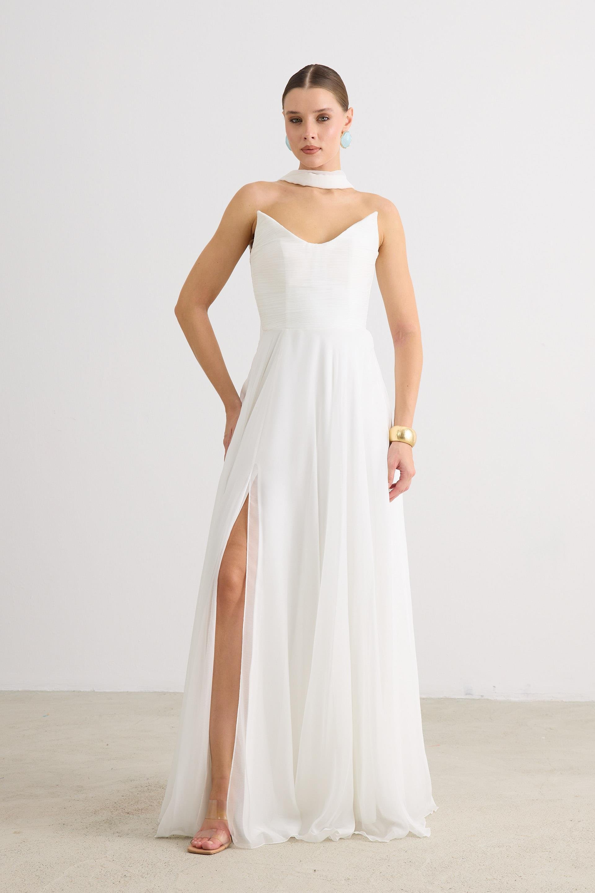 58530-6CARMENCarmen Ekru Yırtmaçlı Şifon Nikah Elbisesi