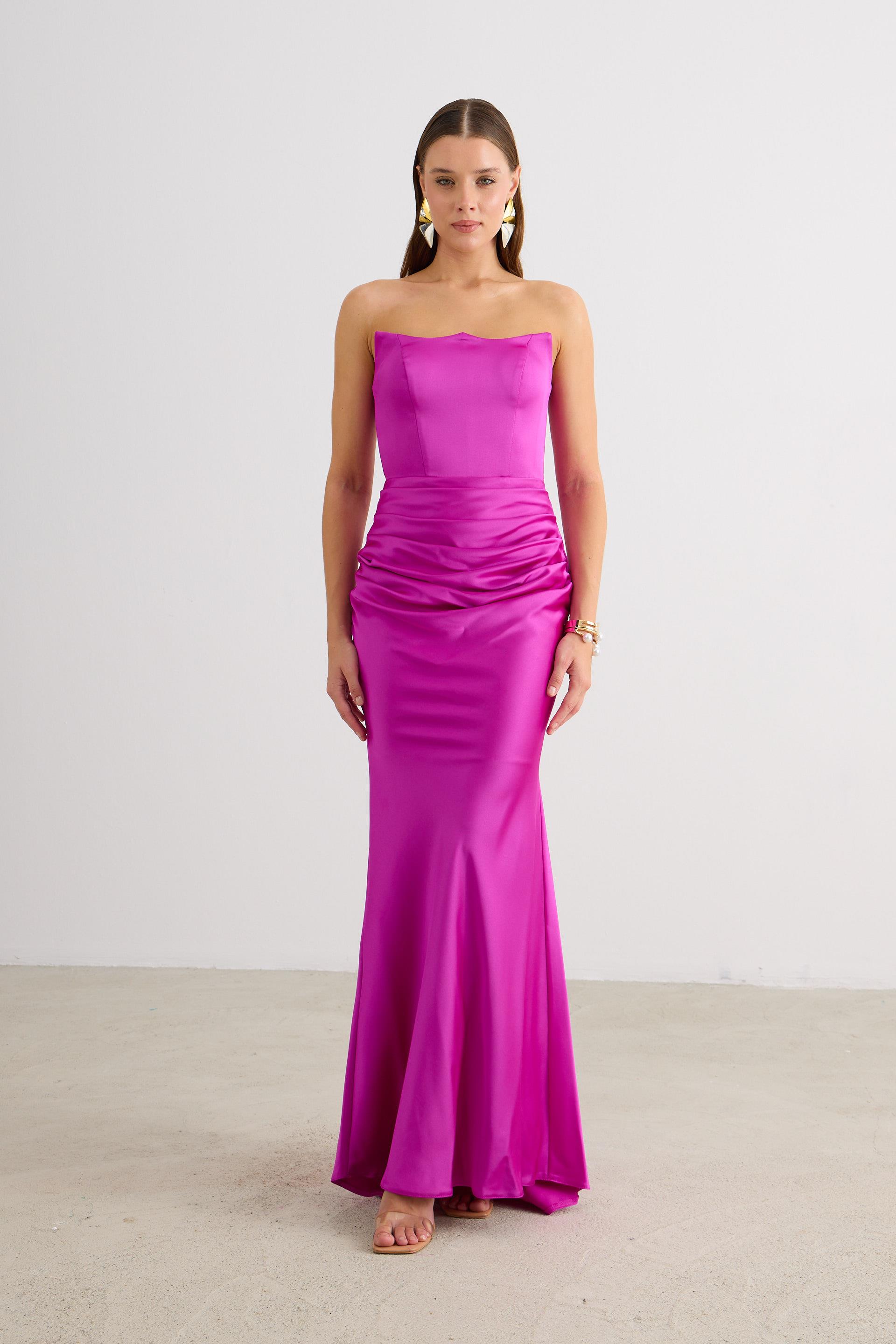 Carmen Fuşya Straplez Uzun Saten Abiye Elbise (58565-8)
