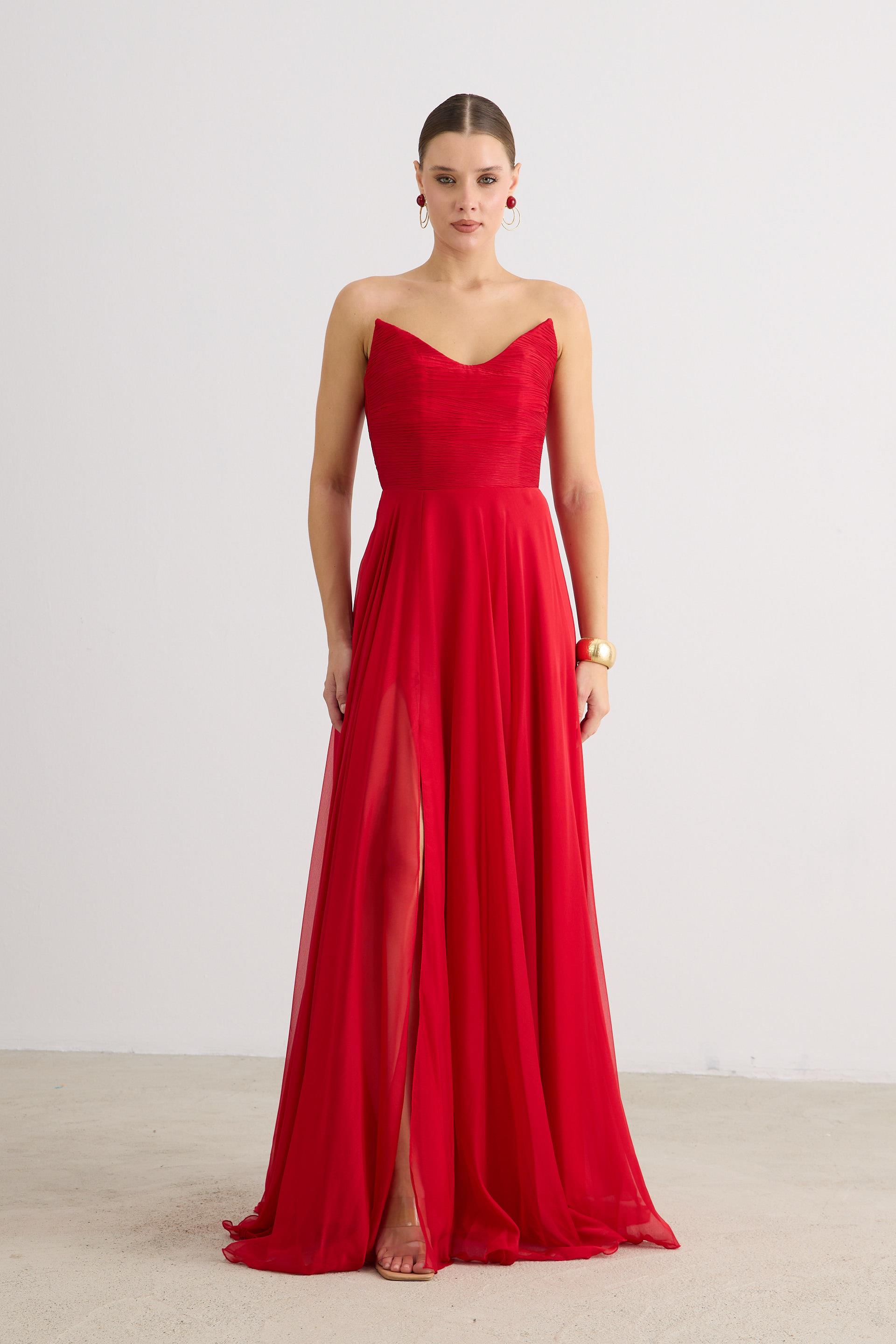 Carmen Kırmızı Yırtmaçlı Şifon Abiye Elbise (58530-13)