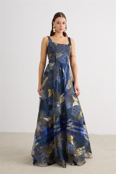 Carmen Lacivert Kare Yaka Jakarlı Abiye Elbise (58605-14)