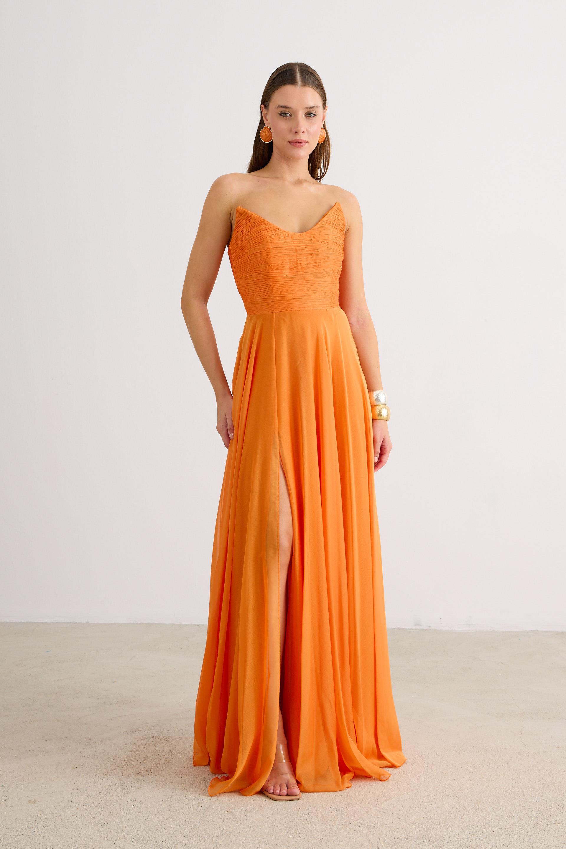 Carmen Orange Yırtmaçlı Şifon Abiye Elbise (58530-106)