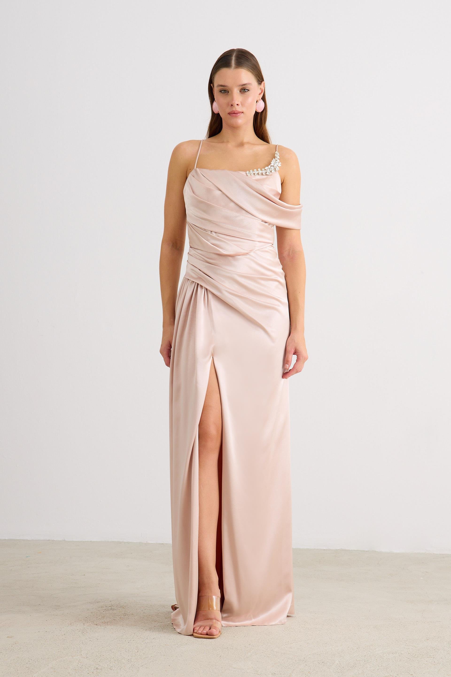 Carmen Pudra Askılı Yırtmaçlı Saten Abiye Elbise (58576-23)