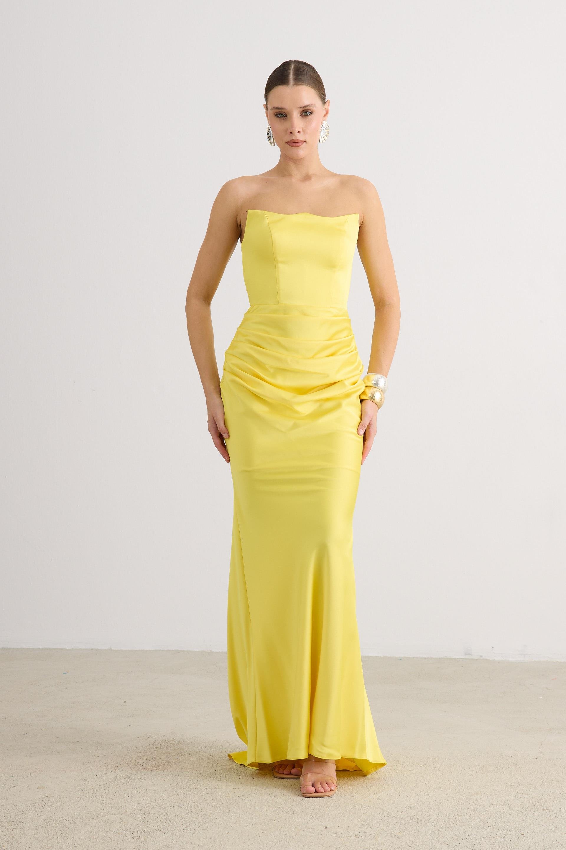 Carmen Sarı Straplez Uzun Saten Abiye Elbise (58565-26)