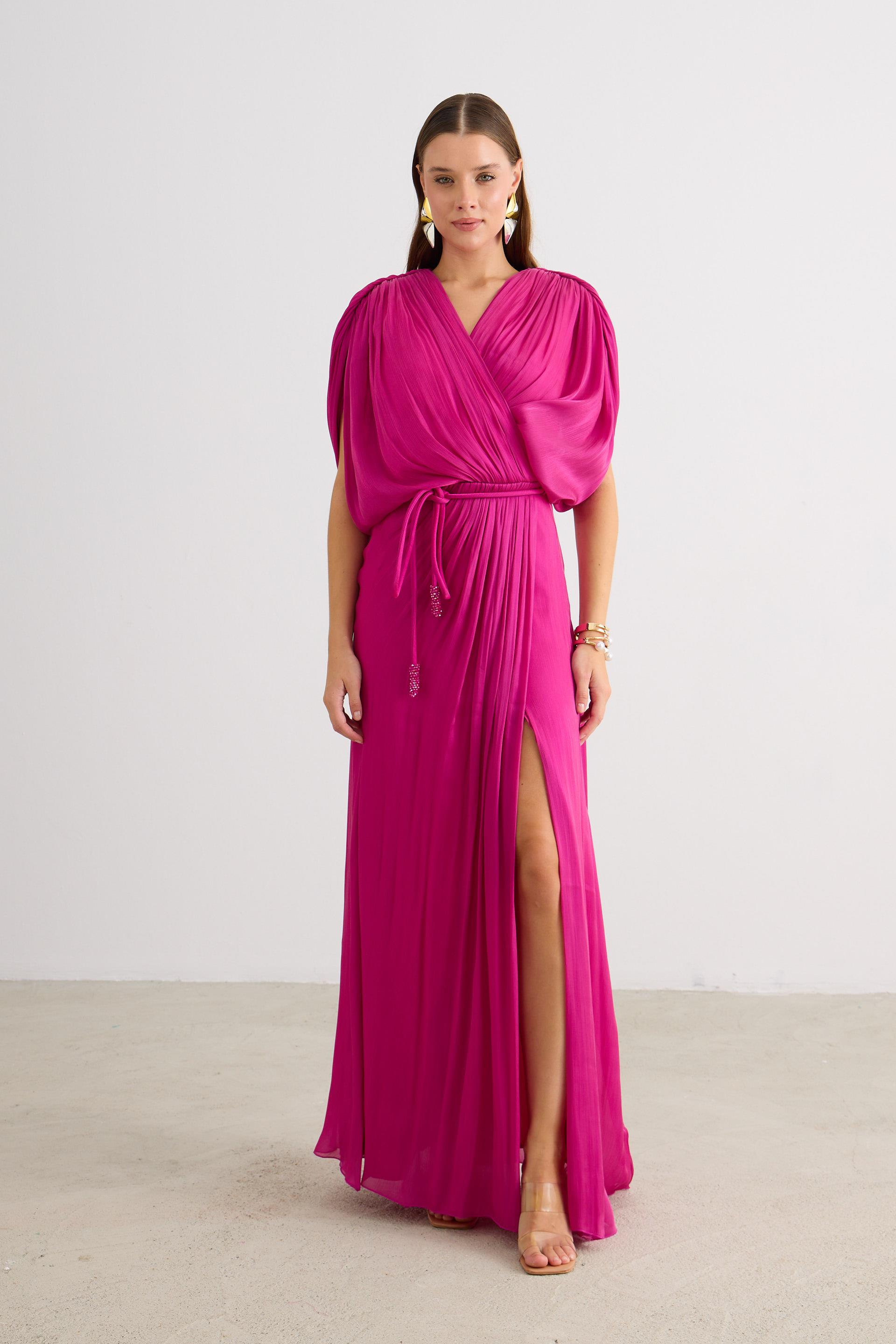 58574-8CARMENCarmen Fuşya Yırtmaçlı Kemerli Organze Abiye Elbise