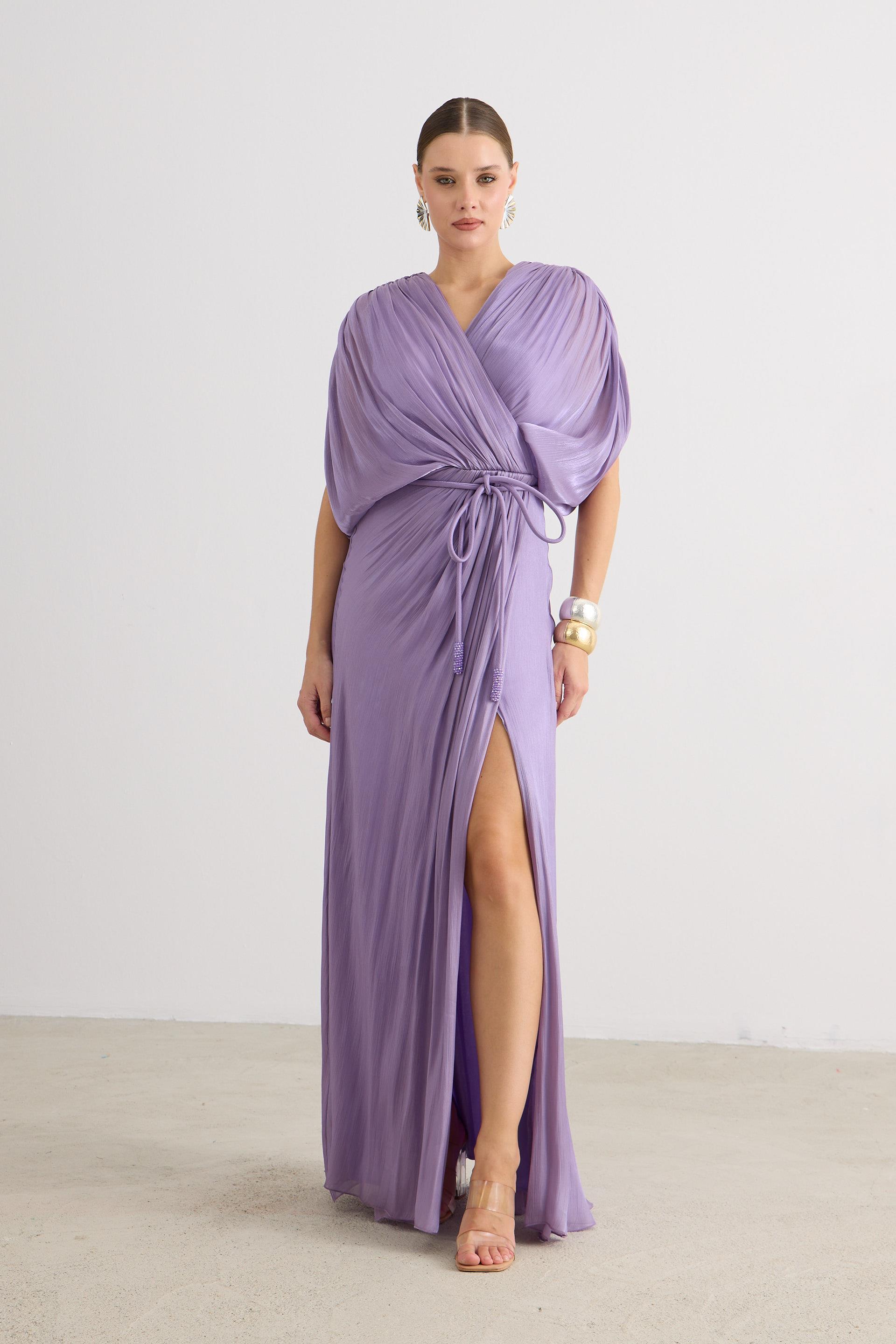 58574-79CARMENCarmen Lavanta Yırtmaçlı Kemerli Organze Abiye Elbise
